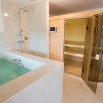 Durch die Hanglage verfügt auch das helle Halbkellergeschoss über einen ebenerdigen Zugang zur Terrasse und dem Garten. Hier befinden sich der Wellnessbereich mit Sauna, Tauchbecken, Dusche und Fitnessraum, ein WC, ein Entspannungsbereich, ein Zimmer, sowie diverse Wirtschafts- und Lagerräume und die Haustechnik.