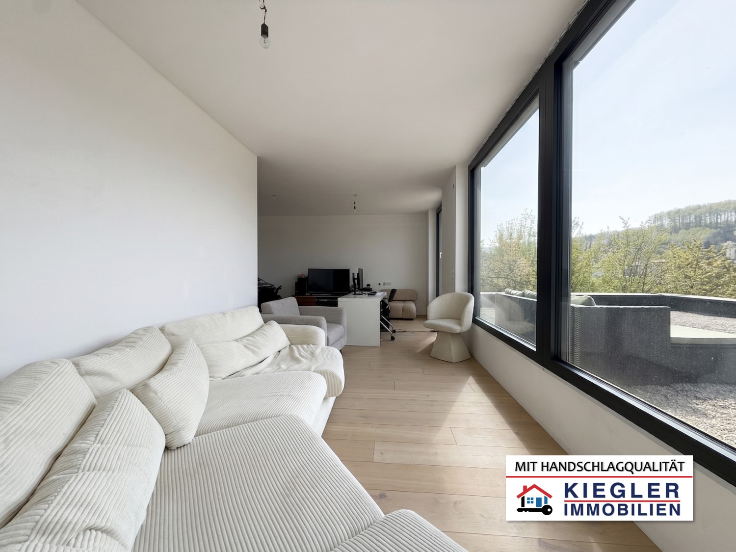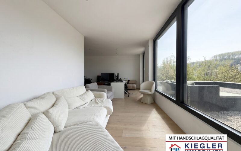 - Wohnbereich: Das 39 m² große Wohnzimmer besticht durch ca. 4 Meter hohe Josko-Panoramafenster, die die Grenzen zwischen Innen und Außen verschwimmen lassen. Von hier gelangen Sie auf die geplante 38 m² große Terrasse.
